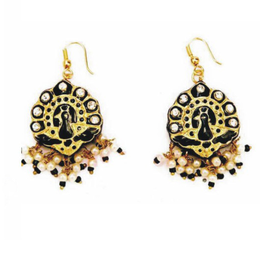 A traditional handcrafted Earring set originating from India.The color of the set is made of enamels, also known as meenakari, and it is intricately hand made with beads,imitation pearls, and cz stones.