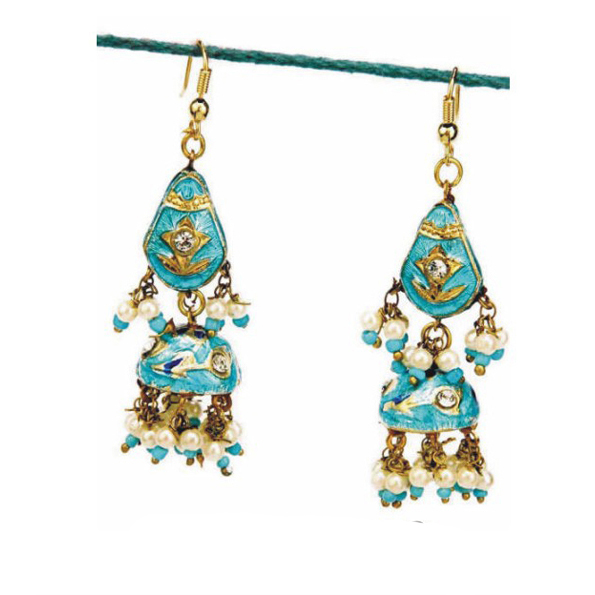A traditional handcrafted Earring set originating from India.The color of the set is made of enamels, also known as meenakari, and it is intricately hand made with beads,imitation pearls, and cz stones.