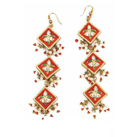 A traditional handcrafted Earring set originating from India.The color of the set is made of enamels, also known as meenakari, and it is intricately hand made with beads,imitation pearls, and cz stones.