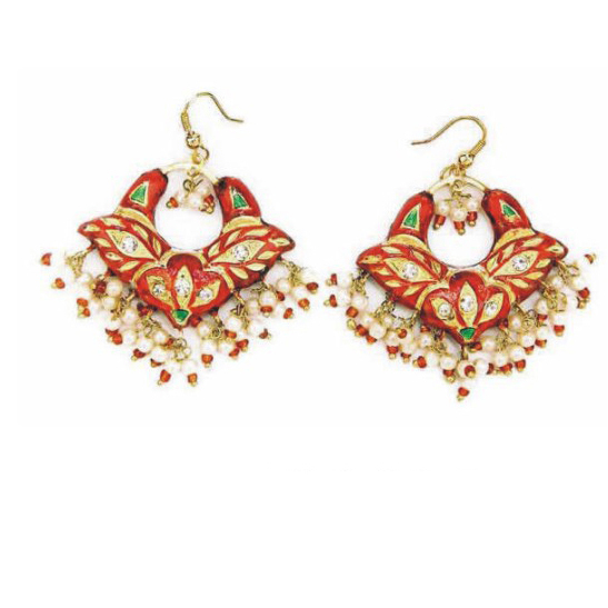 A traditional handcrafted Earring set originating from India.The color of the set is made of enamels, also known as meenakari, and it is intricately hand made with beads,imitation pearls, and cz stones.