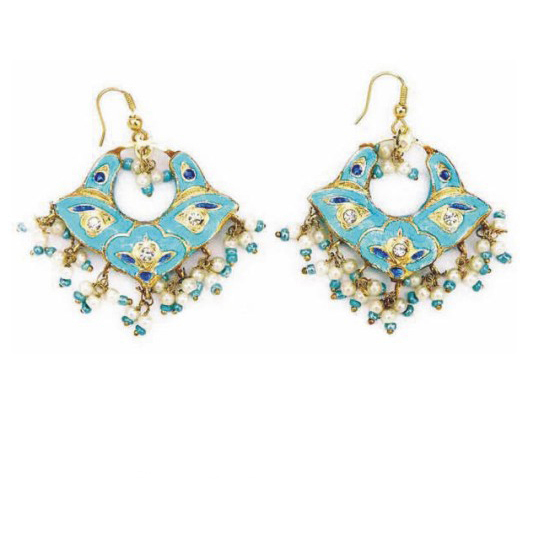 A traditional handcrafted Earring set originating from India.The color of the set is made of enamels, also known as meenakari, and it is intricately hand made with beads,imitation pearls, and cz stones.