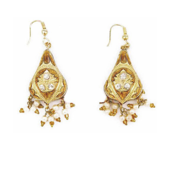 A traditional handcrafted Earring set originating from India.The color of the set is made of enamels, also known as meenakari, and it is intricately hand made with beads,imitation pearls, and cz stones.