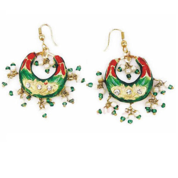 A traditional handcrafted Earring set originating from India.The color of the set is made of enamels, also known as meenakari, and it is intricately hand made with beads,imitation pearls, and cz stones.
