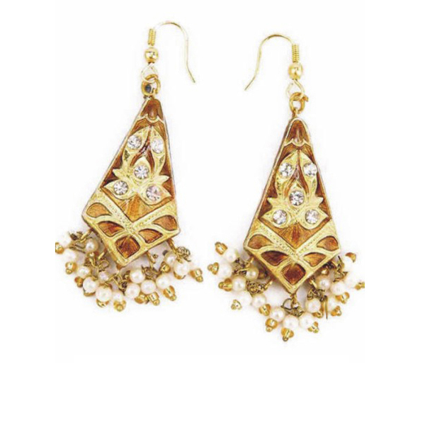 A traditional handcrafted Earring set originating from India.The color of the set is made of enamels, also known as meenakari, and it is intricately hand made with beads,imitation pearls, and cz stones.
